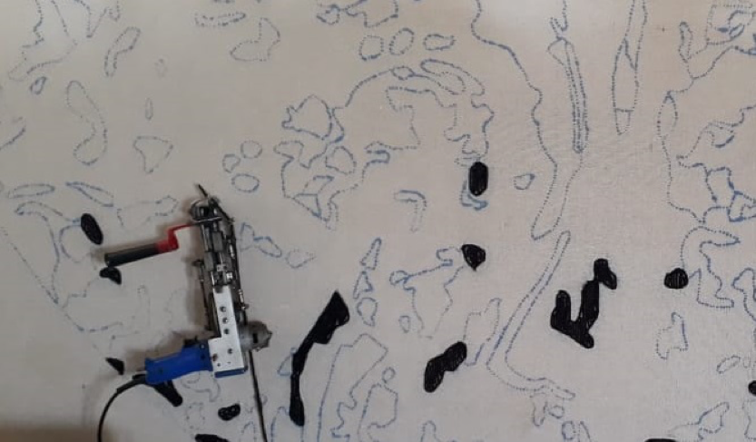 The hand tufting process involves the design of the rug to be transferred on to a piece of cloth known as the backing material. This backing material is then set up on a loom. The yarn is threaded through the tufting tool often called a hand tufting gun. This yarn is then punched through the backing material forming a loop with the help of the tufting gun. Lines are made along with the printed pattern on the backing material. The loops are then cut to form the pile. Variations may be achieved in the tufting process by leaving the loops as it is or creating a combination rug of the loop and cut pile.